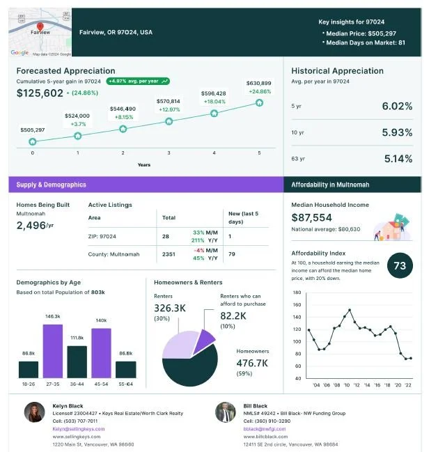 The real estate market in Fairview reflects the area's desirability. In 2024, the median home price in Fairview is around $450,000, with properties ranging from charming mid-century homes to modern townhouses and luxurious waterfront estates. The city has seen steady growth, with a demand driven by its affordability compared to Portland and its appeal as a commuter-friendly location. Homes tend to sell quickly, often within 20-30 days, highlighting the competitive nature of the market.